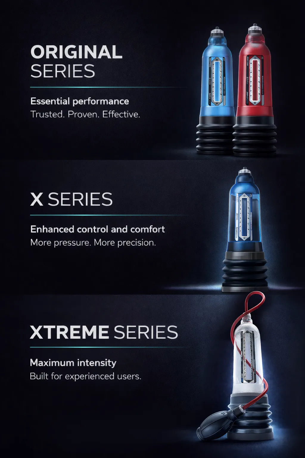 Over time, Bathmate evolved into a full range of advanced penis pumps designed to meet different goals and experience levels. Continuous improvements in pressure control, sealing, comfort, and durability led to the Hydromax series, which offers multiple sizes to ensure a proper fit for every user, supporting erect lengths from 3 inches up to 9 inches. Each model builds on proven hydro technology to deliver faster results with greater confidence.